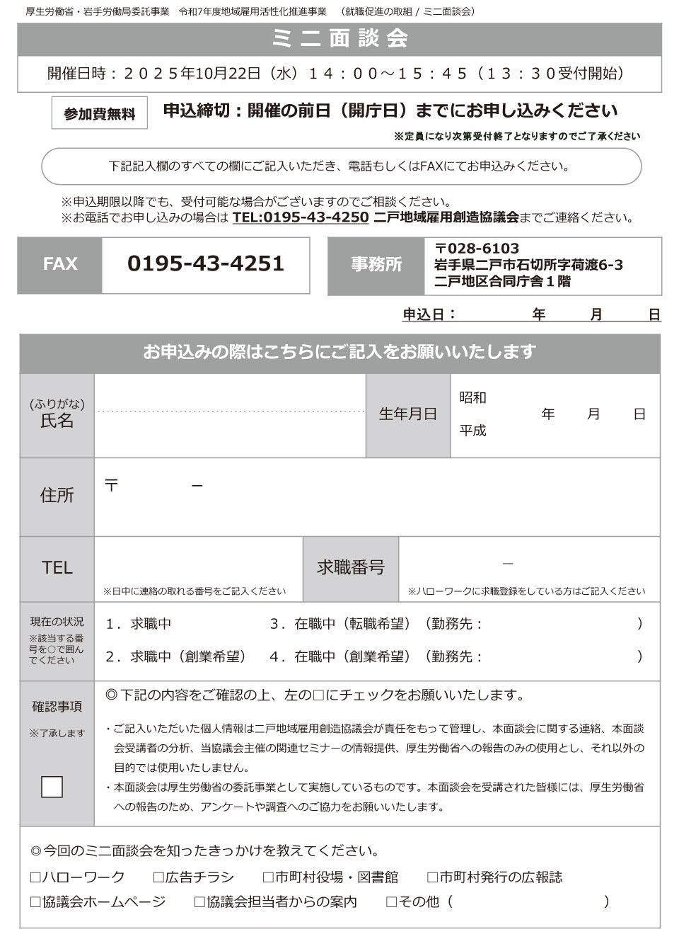 | 申込方法 | ご希望の企業へエントリーしたい方はお問い合わせフォーム、またはチラシ裏面の申し込み欄に記入して提出いただくことでお申込み頂けます。 |
