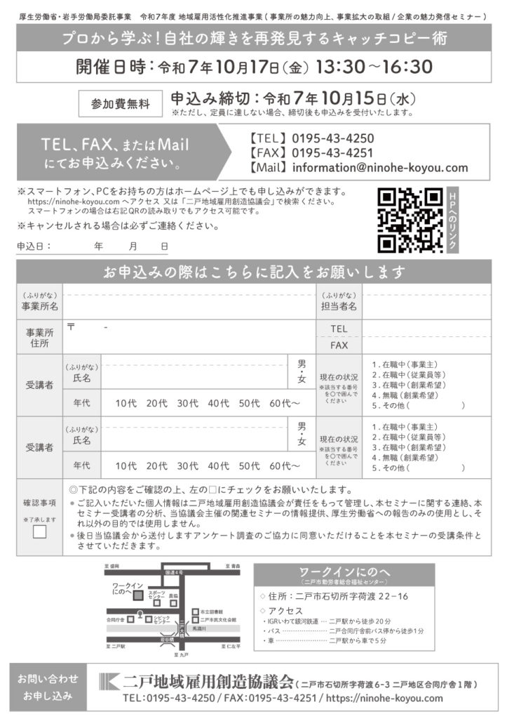| 会場 | 二戸市勤労者総合福祉センター (ワークインにのへ) 2階 研修室 |