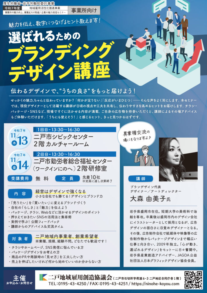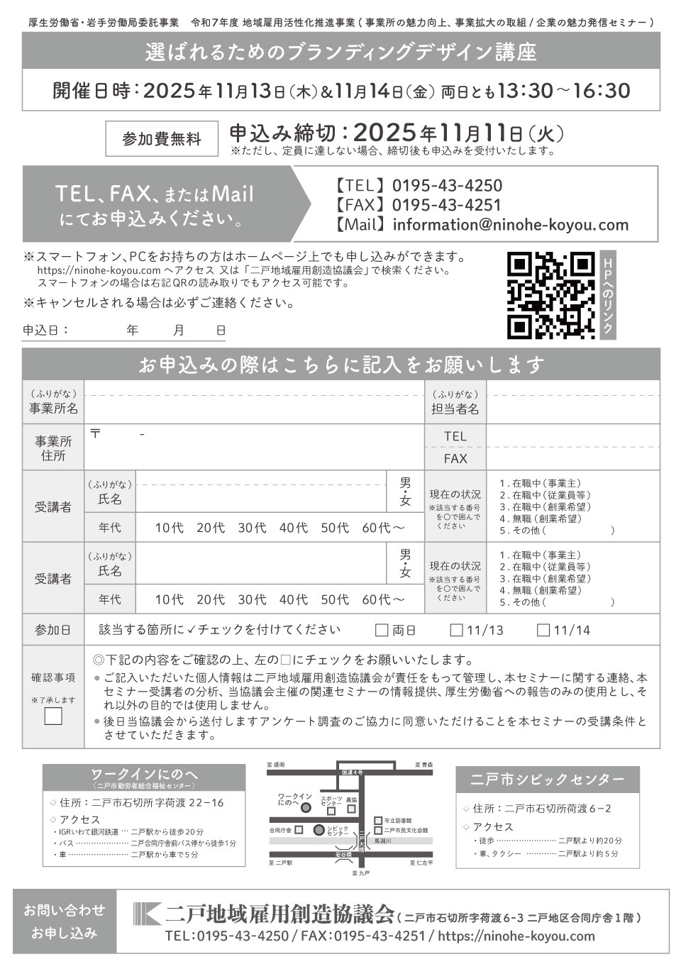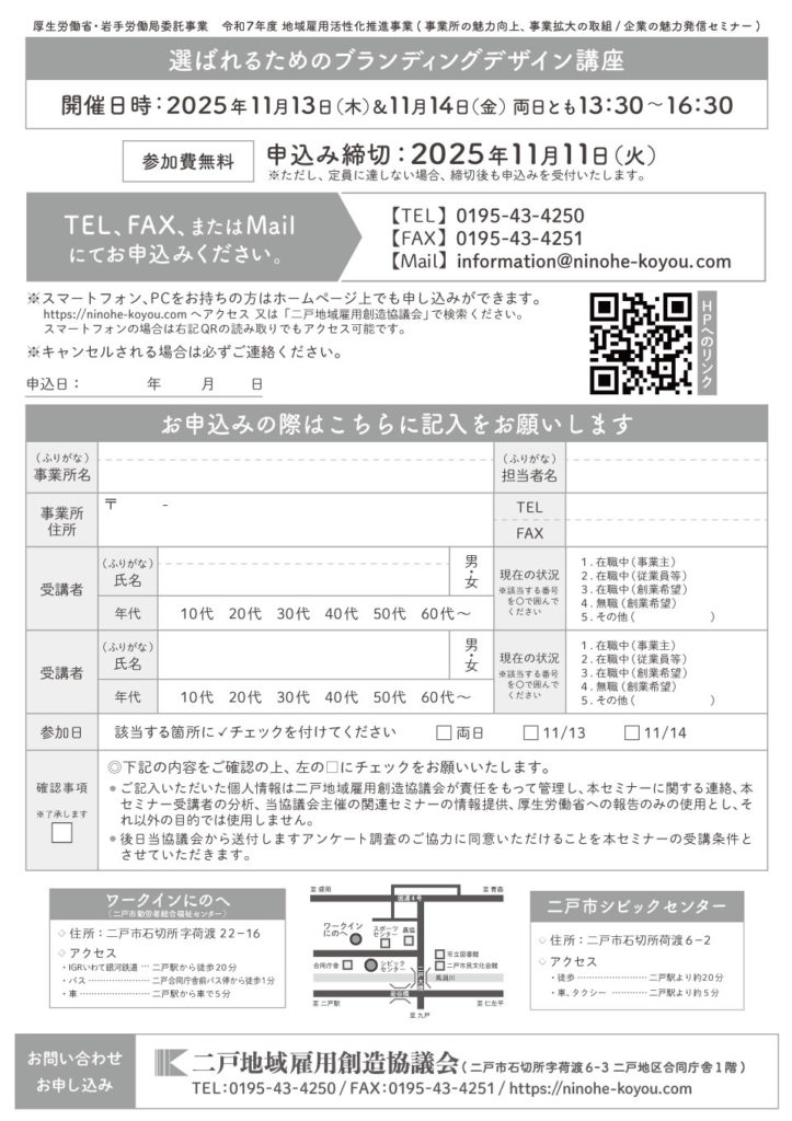| 会場 | ①11月13日(木) 二戸市シビックセンター 2階 カルチャールーム ②11月14日(金) 二戸市勤労者総合福祉センター (ワークインにのへ) 2階 研修室 |