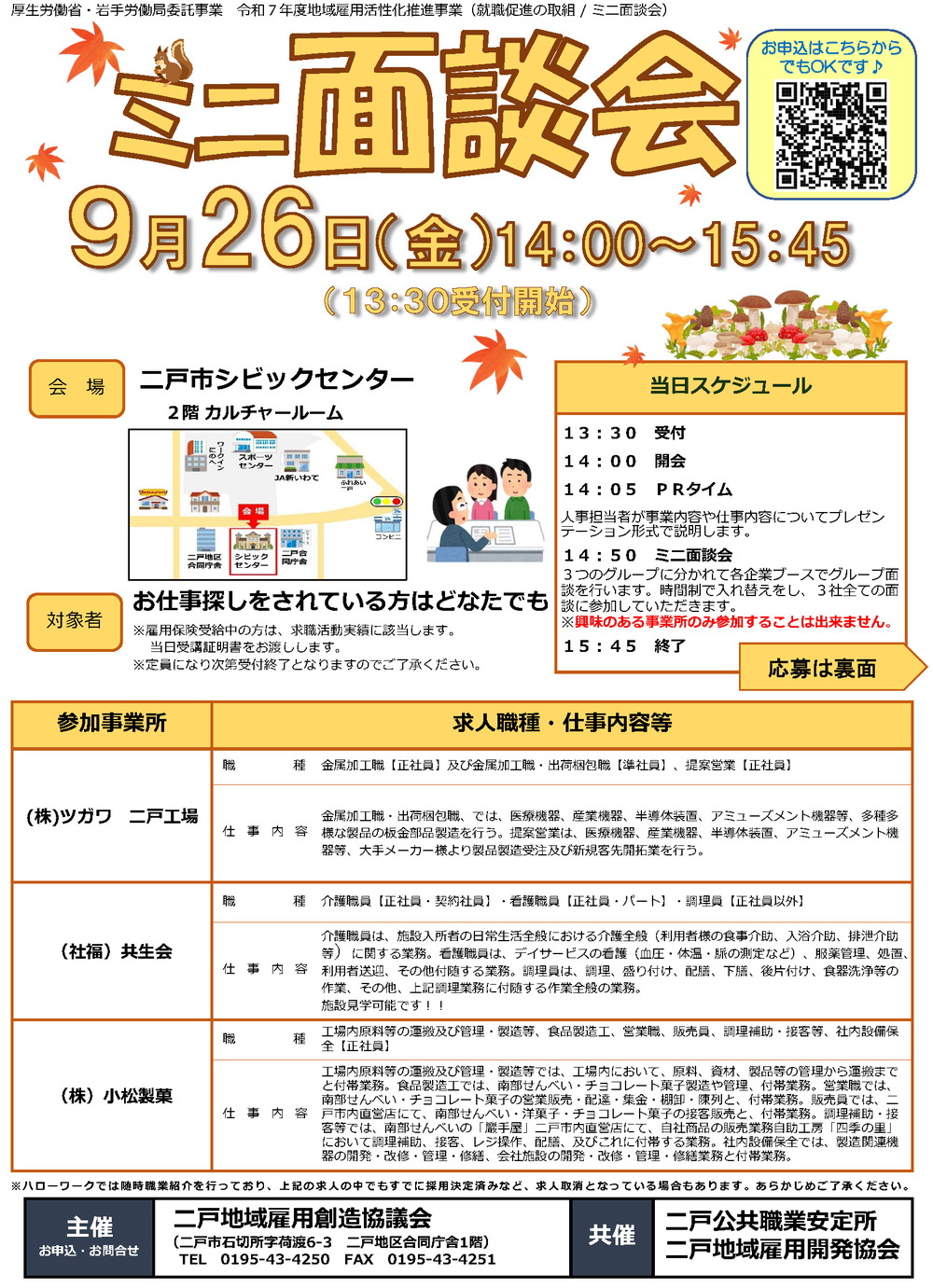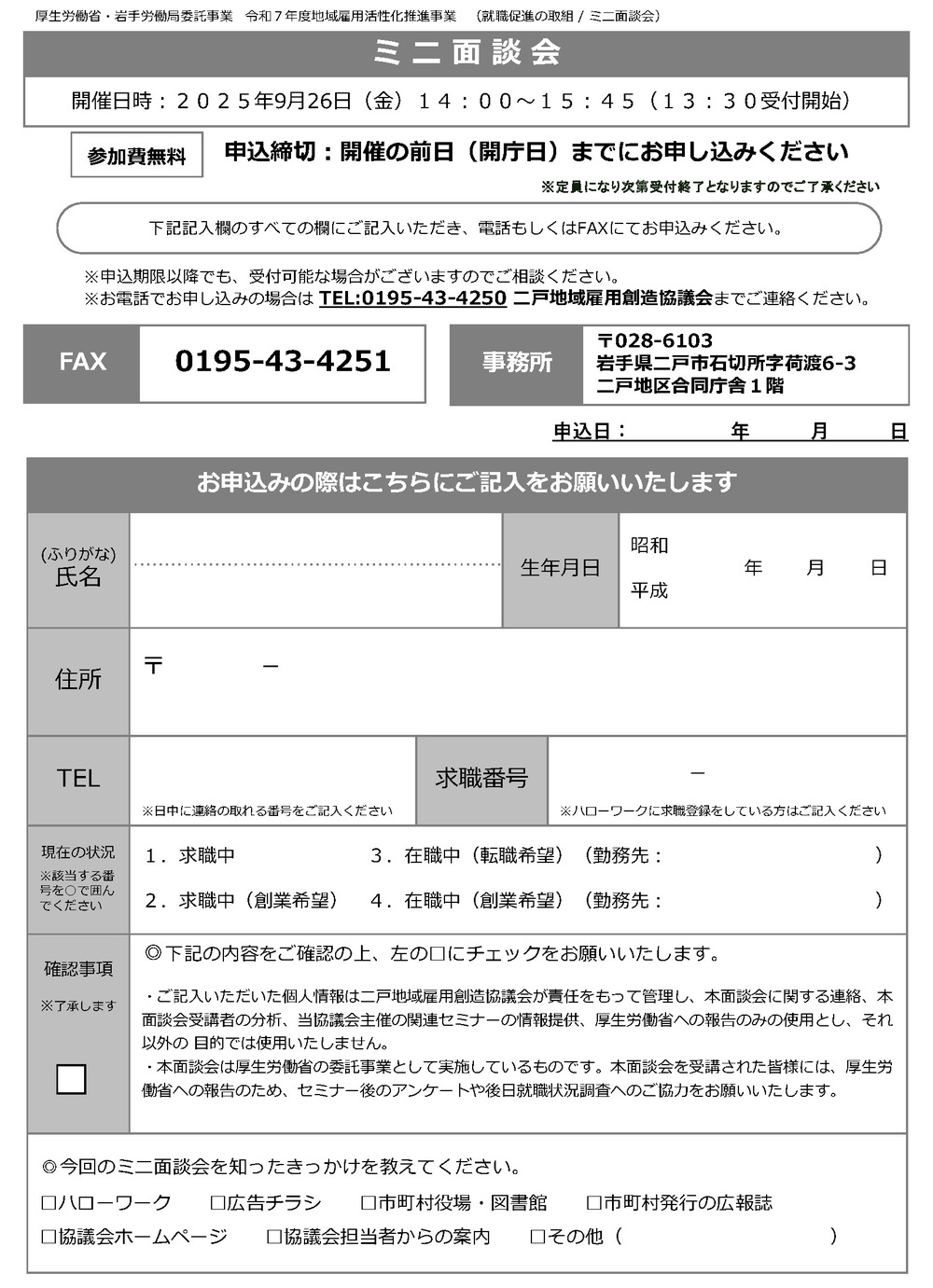 | 申込方法 | ご希望の企業へエントリーしたい方はお問い合わせフォーム、またはチラシ裏面の申し込み欄に記入して提出いただくことでお申込み頂けます。 |