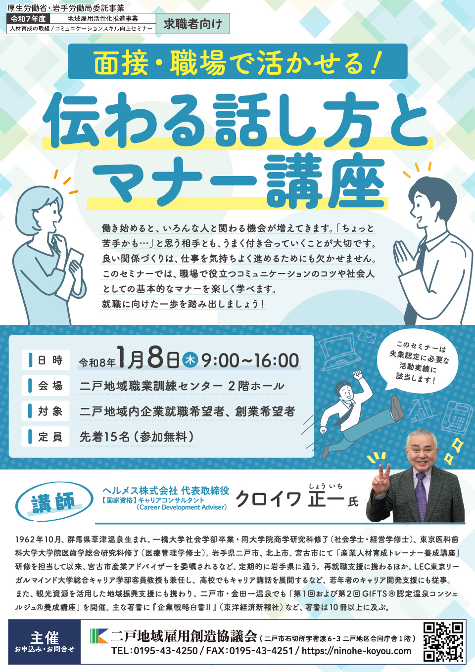 求職者のための伝わる話し方とビジネスマナーについて学べるセミナーです。