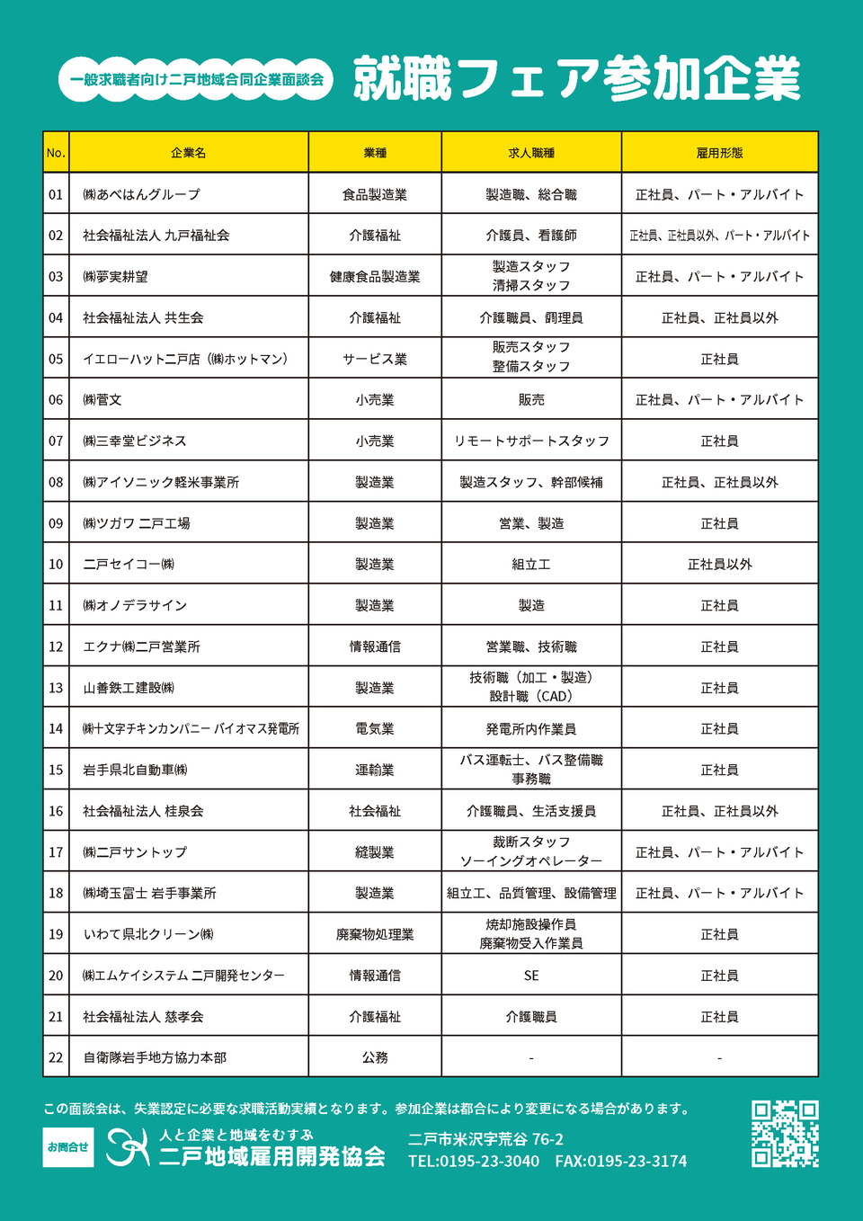 二戸地域の企業へ就職を目指す方向けの就職フェアです。22社の担当者から仕事内容などを聞くことができますので、ぜひご参加ください。